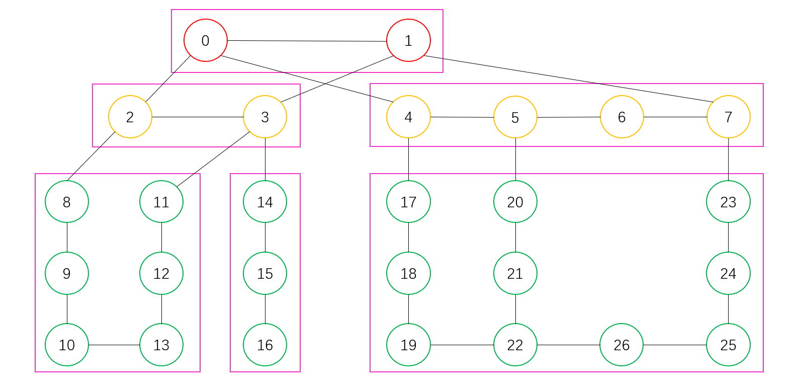 如下图所示,每个圆圈代表一台设备,圆圈的颜色用以区分设备所属的设备层级,黑色的线代表设备之间的链路连接,每个粉色框是一个独立拓扑,最大的独立拓扑是右下角的,包括了\(10\) 台设备。