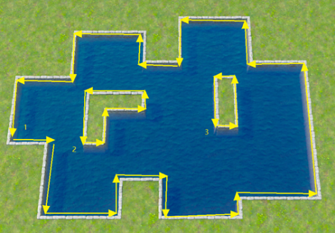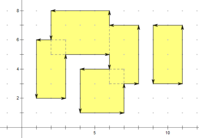 《新倩女幽魂》最近正在迭代家园玩法,新增了一个家园建造水池的功能,玩家可以多次使用自定义大小的矩形生成水池区域。小倩为了记录水池形状,需要从左下角的顶点(优先x坐标最小,其次y坐标最小的点),以逆时针的顺序依次记录水池边的顶点。玩家可能会生成多组不连通的水池(图1的1和2),需要分别记录(输出时分行表示不连通的水池);玩家建造的水池可能会形成内陆,也需要分行输出内陆边缘的信息(图2的2和3)。
