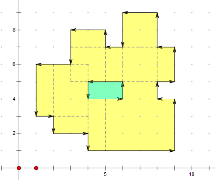 根据\(g\)数组,可以知道一个坐标点是否在某条边界上。按顺序枚举\(x\)坐标最小,如果有多个点相同,\(y\)坐标最小的点\((x_0,y_0)\),按照\(g\)数组沿着这条边界环绕一圈,并记录所有转弯处的节点即可。这条边界就是题目所求的边界。需要注意的有以下三点: