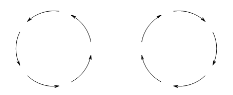 另外,如果这五个方向以逆时针迭代一圈,那就能够下图的左边部分,相当于机器人逆时针走了一个完整的圈;如果以顺时针迭代一圈,那么就能够得到右边部分,相当于机器人顺时针走完了一个圈。因此机器人走完\(m\)步最终回到原点时,相当于这个机器已经走了逆时针\(j\)个圈,顺时针\(n-j\)个圈,其中\(0\le j\le n\)。