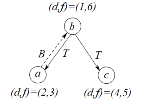 本例子重用题目20.3-7所提出来的图。如果按照从\(b\rightarrow a\rightarrow b \rightarrow c\)的顺序访问各个节点,由于从\(b\)到\(c\)就会有路径\(b\rightarrow a\rightarrow c\),并且按照从\(b\rightarrow a\rightarrow b \rightarrow c\)的顺序访问各个节点,那么有\(c.d=4,a.f=3\),这是不满足条件\(c.d\le a.f\)的。