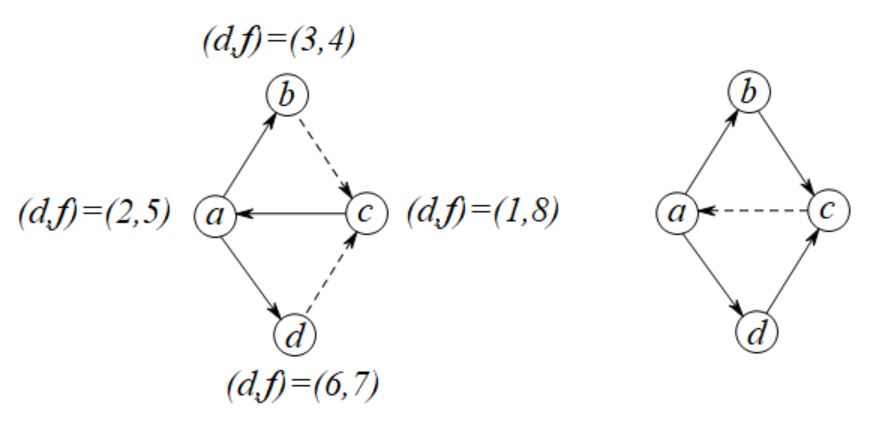 如果按照\(c,a,b,d\)的顺序发现\(G\)中的所有节点,那么每个节点的时间戳如图所示,最终产生的拓扑序列为\((c,d,a,b)\),它将会产生\(2\)条坏边\((b,c),(d,c)\)。然而序列\((a,b,d,c)\)只产生\(1\)条坏边(如右图所示)。