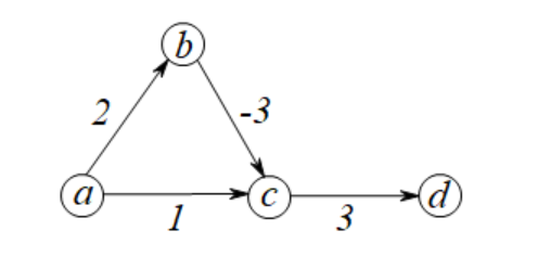 令\(G=(V,E),V=\{a,b,c\},E=\{(a,b),(b,c),(a,c),(c,d)\},w(a,c)=1,w(a,b)=2,w(b,c)=-3,w(c,d)=3\),如下图所示: