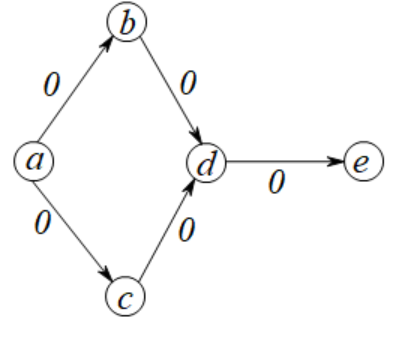 令\(G=(V,E),V=\{a,b,c,d,e\},E=\{(a,b),(b,d),(a,c),(c,d),(d,e)\},w(a,b)=w(b,d)=w(a,c)=w(c,d)=w(d,e)=0\),如下图所示: