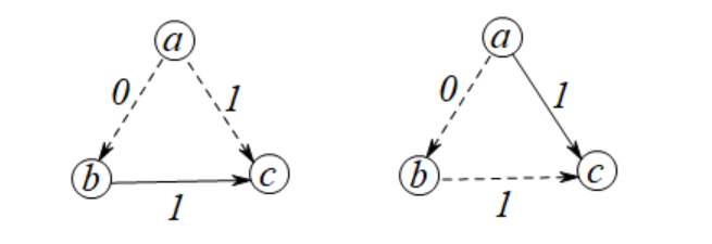 也就是说,对于边\((a,c)\),它存在一棵最短路径树\(T_1=(V,E_1)\)中,但不存在\(T_2=(V,E_2)\)中。