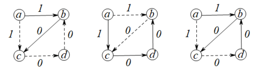 令\(G=(V,E),V=\{a,b,c,d\},E=\{(a,b),(a,c),(b,c),(c,d),(d,b)\},w(a,b)=w(a,c)=1,w(b,c)=w(c,d)=w(d,a)=0\)。