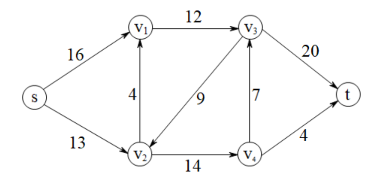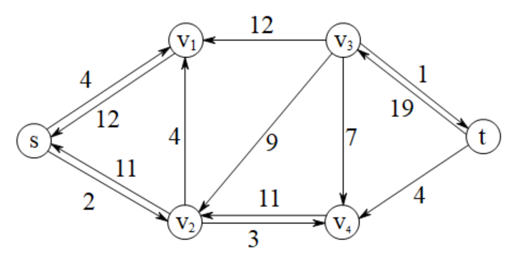\(\begin{array}{|c|c|c|}\hline e&f&c\\\hline (s,v_1)&11&16\\\hline (v_2,v_1)&1&4\\\hline (v_4,v_3)&7&7\\\hline (v_4,t)&4&4\\\hline \end{array}\)