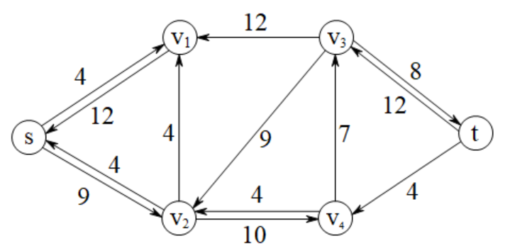 随后找到了一条增广路径\((s,v_2,v_4,t)\),其流量值为\(4\)。由此可以对残余网络进行更新: