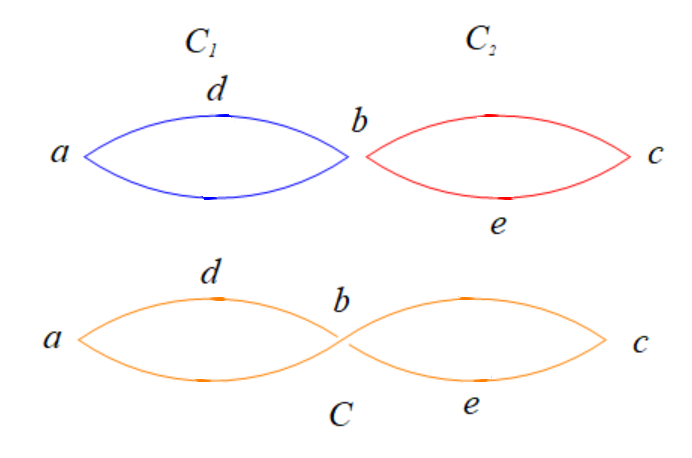 如图所示,我们已经找到了两个环\(C_1:b-d-a-b\)和\(C_2: b-e-c-b\),那么我们可以整合成回路\(C:b-d-a-b-c-e-b\)。