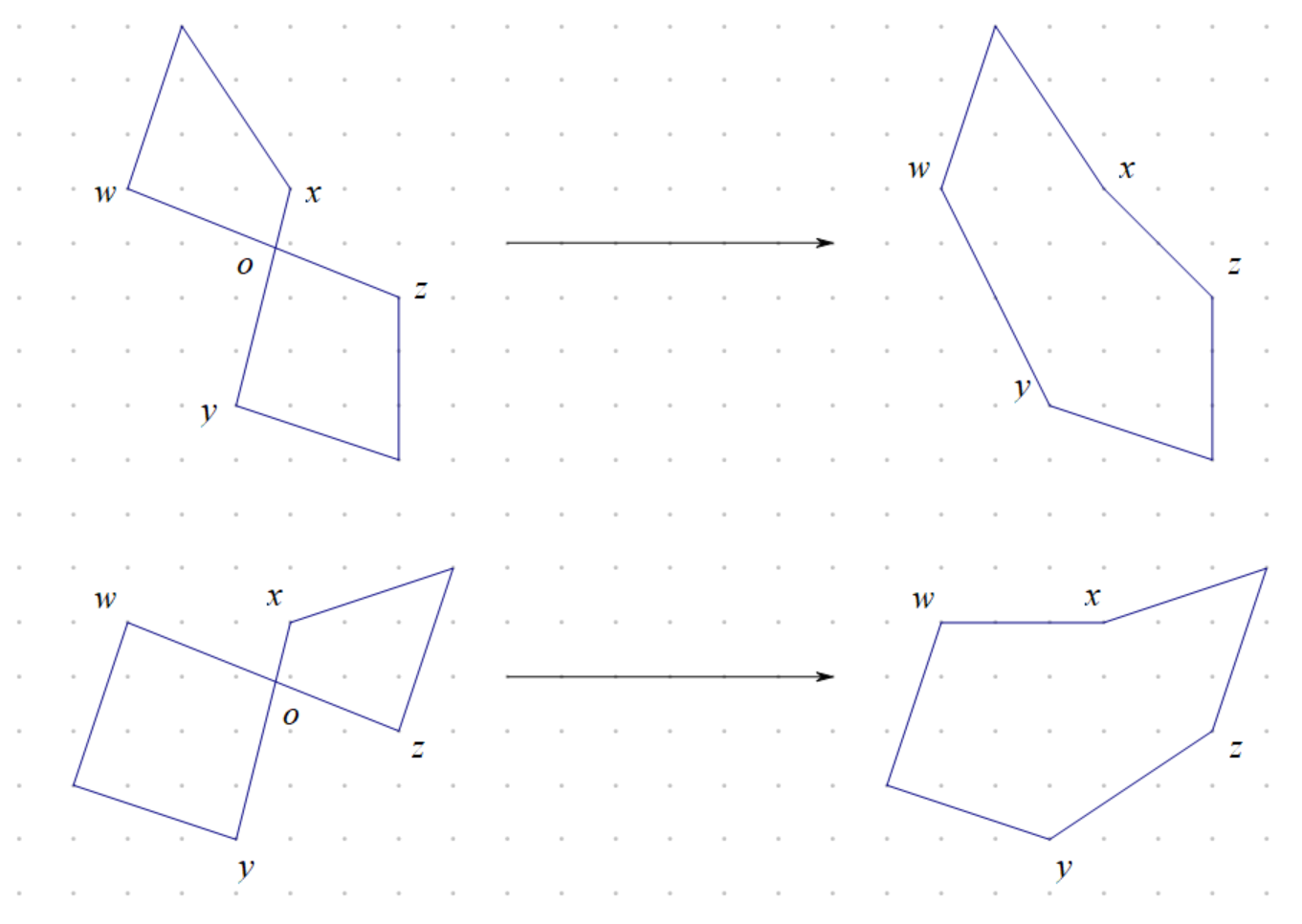 如图所示,不失一般性,假设一段旅行\(C\)中,边\((w,z)\)和边\((x,y)\)相交在平面上相交,假设交点为\(o\)。那么可以知道,对于三角形\(wxo,xzo,zyo,ywo\),可以写出下列\(4\)个不等式: