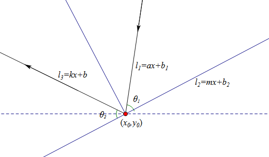 第一个是已知两条直线\(l_1:y=ax+b_1,l_2:y=mx+b_2\),求\(l_1\)关于\(l_2\)对称的直线。其中,已知它们的交点\(l_1\cap l_2=(x_0,y_0)\).