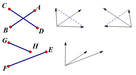 用数学语言描述来说:如果\((\overrightarrow{BC}\times \overrightarrow{BA}) \cdot(\overrightarrow{BD}\times \overrightarrow{BA})<0\)并且有\((\overrightarrow{DA}\times\overrightarrow{DC})\cdot(\overrightarrow{DB}\times \overrightarrow{DC})<0\),那么线段\(AB\)和\(CD\)是有真交点的。