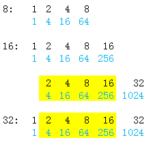 黑色一行为当前数的质因子,蓝色的一行为因子平方和。\(16\)通过一个旧的质因子\(2\)筛出来了一个新数\(32\)。新构造的一部分因子平方,和原来\(16\)的一部分因子平方是重叠的(如图黄色部分),因此直接相加会导致重复。不难理解,这一重复部分完全可以用\(8=16/2\)的那一部分来表示,也就是\(\sigma_2(i/p)\cdot p^2\)。因此,这种情况下,\(\sigma_2(i\cdot p)=\sigma_2(i)+(\sigma_2(i)-\sigma_2(i/p))p^2\)来表示。