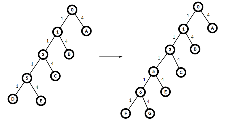 令\(N=10^9\)。将这些编码方式按照公共前缀,可以构成一棵二叉树,每一个叶节点代表着一种编码方式。那么,我们就使用贪心的思想,考虑找到一个当前花费(深度)\(c\)最小的叶节点,然后将其编码分别添加一个\(0\)和\(1\),分别在这棵树上形成两个新的叶节点,花费分别为\(c+1,c+4\)。如下图所示。