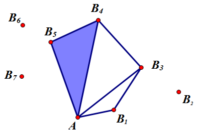 考虑状态\(f(i,j)(1\le j< i\le m)\)表示逆时针方向上,以\(\triangle AB_iB_j\)为最后一个三角形的凸包中,最大的面积值。需要注意的是,不存在其它点\(B_k\)使得\(B_k\)落在\(\triangle AB_iB_j\)的内部(不包括边界)时,并且\(O,B_i,B_j\)不共线时,\(f(i,j)\)才是一个合法状态。对于所有不合法的状态,状态值\(f\)为\(0\)。
