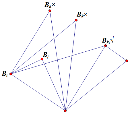 - \(B_{k'}\)在向量\(\overrightarrow{B_iB_{j}}\)左侧,它们都是不合法的,因为\(B_j\)在\(\triangle AB_iB_k\)内部。