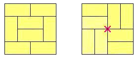 The arrangement on the left is acceptable, whereas the one on the right is not: a red “X” in the middle, marks the point where four tatami meet.