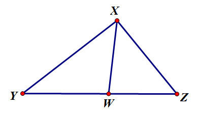角平分线定理讲述了角平分线将一个三角形划分成两部分后,各边的关系。如图,假设\(XW\)是\(\triangle XYZ\)的一条角平分线,那么满足:\(\dfrac{|XY|}{|XZ|}=\dfrac{|WY|}{|WZ|}\)。