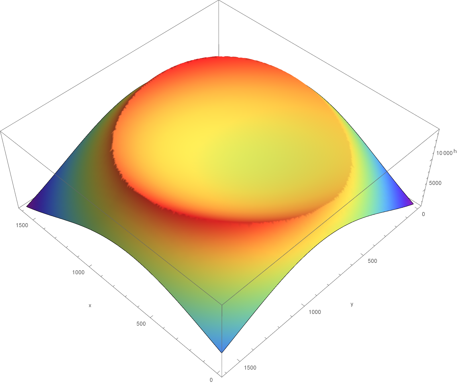 1 | h=(5000-0.005*(x*x+y*y+x*y)+12.5*(x+y))*exp(-abs(0.000001*(x*x+y*y)-0.0015*(x+y)+0.7)) |