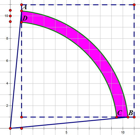 在原点画一个半径为\(k\)的圆。可以发现,如果最终\(\sqrt{x^2+y^2}\)可以四舍五入到\(k\),那么\(|\sqrt{x^2+y^2}-k|\leq \dfrac{1}{2}\),因此,画两个半径为\(k+\dfrac{1}{2}\)和\(k-\dfrac{1}{2}\)。只要在这两个圆之间的所有点,都满足这个条件。
