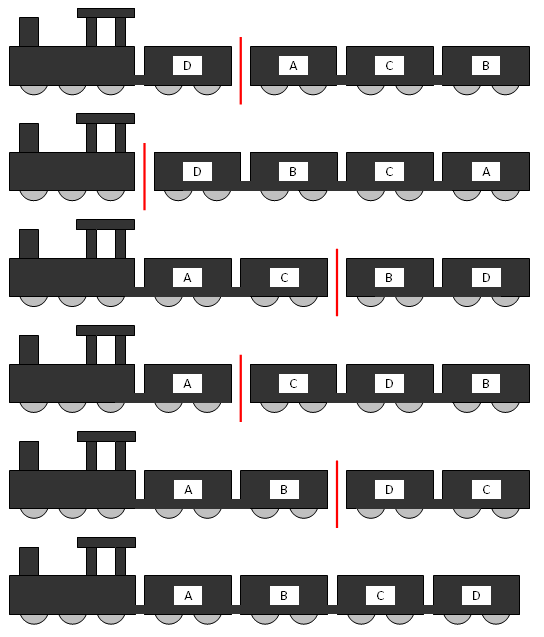 A train is used to transport four carriages in the order: ABCD. However, sometimes when the train arrives to collect the carriages they are not in the correct order.