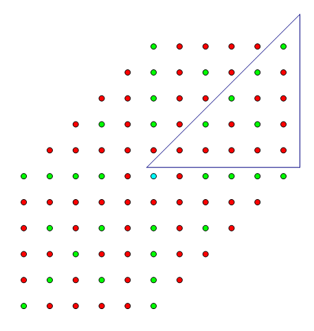 对于原来的六边形,由于六片中,每一片都是平等的,因此我们只考虑\(x\)轴逆时针旋转\(60°\)这一片的计算,而这一片在新的坐标中则对应着上图中蓝色三角形的那一部分,我们只考虑的点是\((x,y)\),其中\(1\le y\le x\le n\)。