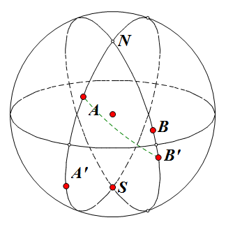 假设\(d(A,B)\)表示两个考察站的点之间的最小风险距离,并假设\(N\)是北极点,\(S\)是南极点,\(A,B\)是北半球的任意两个点,\(A',B'\)则是它们对应在南半球的对称点,并且,\(AA'\)和\(BB'\)中间不存在其它点。