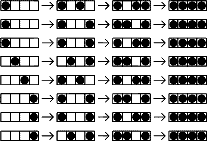 题目中的第\(1\)轮的占座位过程完成后,相邻的两个被占座位距离要么间隔\(1\)个空座位,要么间隔\(2\)个空座位。我们考虑第\(1\)步占座完成后的情形。