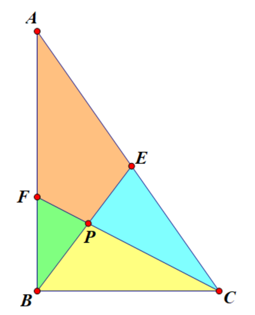 因此不失一般性地可设\(B(0,0), C(1,0), A(0,2s),\)从而\(S_{\triangle ABC}=s.\)接下来把四块区域面积约定为:\(a=S_{\triangle BPC},b=S_{\triangle BFP},c=S_{\triangle CPE},d=S_{AFPE},\)并且\(s=a+b+c+d.\)