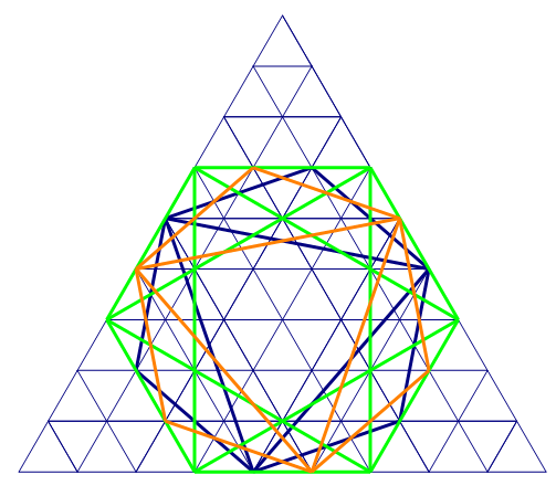 并且,这些正六边形都只能镶嵌在边长为\(3\)的倍数的等边三角形上,如图: