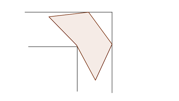 把走廊放在第一象限,外墙为两坐标轴 \(x=0\)、\(y=0\),内拐角为 \((w,w)\)(走廊宽度为 \(w\))。若桌子在某一朝向下被推到外墙(即平移使其最小 \(x\) 与最小 \(y\) 都为 \(0\)),则此时它能放入宽度为 \(w\) 的 L 形走廊,当且仅当桌子不进入禁止区域\(\{(x,y): x>w\land y>w\}.\)