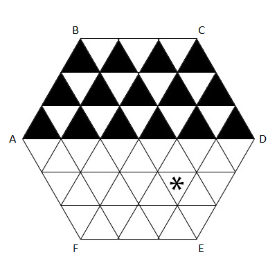 For example, \(J(T) = 3\) for the triangle marked with a star in the picture: by jumping from the centre half way towards \(F\), then towards \(C\), then towards \(E\).