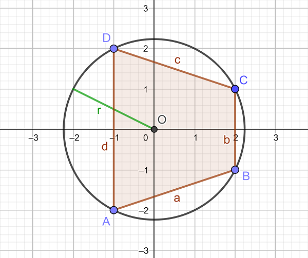 Analogously, we call a quadrilateral \(ABCD\) with sides \(a\), \(b\), \(c\) and \(d\), inscribed in a circle with radius \(r\), a pythagorean quadrilateral, if \(a^2+b^2+c^2+d^2=8\, r^2\).