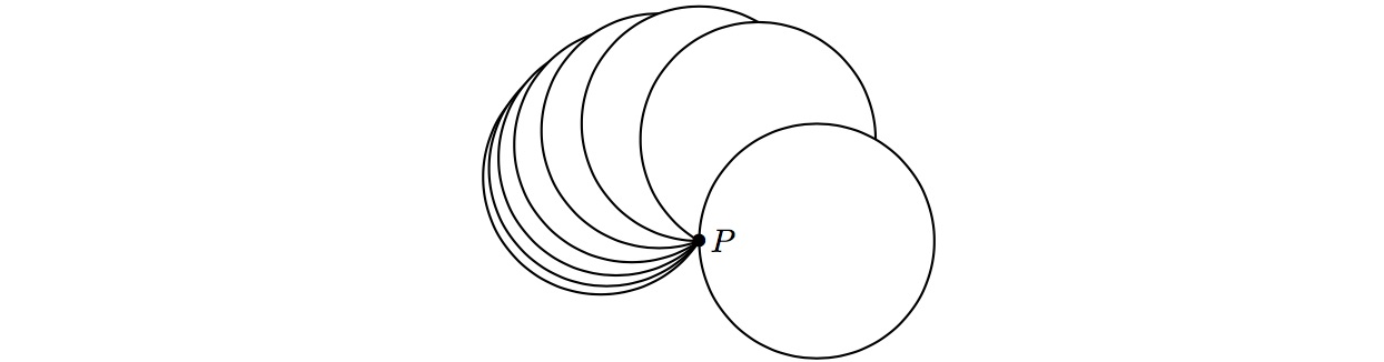 把桌面投影平面中的那条竖线接触点记为点 \(P\),并作为原点。设所有硬币半径都为 \(1\)(缩放不影响角度与圈数)。第 \(k\) 枚硬币圆心记为 \(O_k\)。由于每枚硬币都与竖线相切,所以投影中有\(|O_k|=1.\)