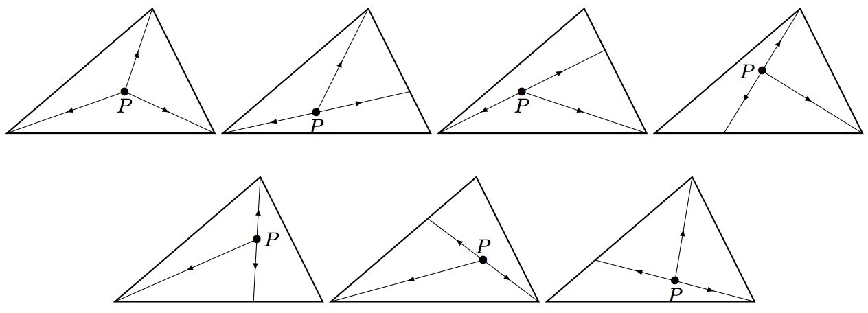 如果 \(PA,PB,PC\) 都是切线,那么大三角形被分成三个以 \(P\) 为公共顶点的子三角形。设这三个子三角形分别包含的小三角形个数为 \(u,v,w\),则:\(u,v,w \ge 1,u+v+w=n.\)