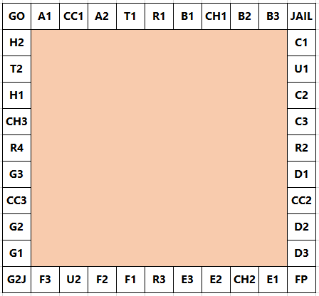 A player starts on the GO square and adds the scores on two 6-sided dice to determine the number of squares they advance in a clockwise direction. Without any further rules we would expect to visit each square with equal probability: \(2.5\%\). However, landing on G2J (Go To Jail), CC (community chest), and CH (chance) changes this distribution.